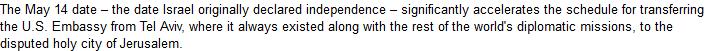| تمكن طاقم الفرع الإسرائيلي من مؤسسة (كاميرا) من دفع صحيفة “لوس أنجلوس تايمز” الأميركية نحو تصحيح الخطأ الذي كان قد ورد في تقريرها المنشور أصلاً يوم 24/2/2018 والذي تناول قرار الإدارة الأميركية تسريع إجراءات نقل سفارتها إلى القدس لتتزامن مع حلول عيد الاستقلال الـ70 لدولة إسرائيل الذي سيوافق يوم 14/5/2018. وقد جاء في الصياغة الأصلية للتقرير أن مقرّ السفارة الأميركية كان يقع حتى الآن في تل أبيب إلى جانب مقارّ جميع البعثات الدبلوماسية.