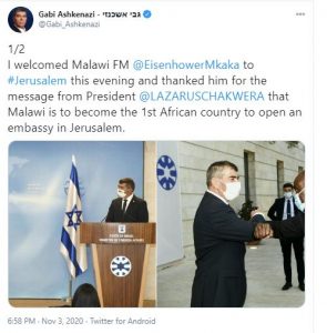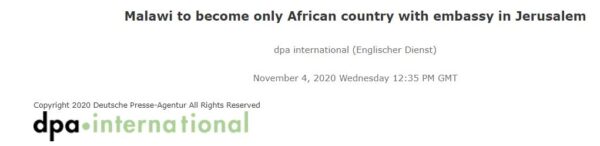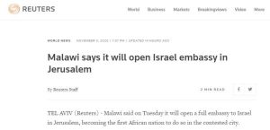 أعلن وزير الخارجية المالاوي، أيزنهاور مكّا، في 3 نوفمبر/تشرين ثان 2020 (مرفق صورة من المؤتمر الصحفي لوزير خارجية مالاوي) أن مالاوي ستفتتح سفارتها هذا الأسبوع في القدس، مما أثار موجة من الأخطاء الإعلامية تم تصحيحها لاحقًا بفضل نشاط CAMERA. كان الخطأ الأكثر شيوعًا هو الادعاء بأن مالاوي ستكون أول دولة إفريقية تفتح سفارة في القدس، عاصمة إسرائيل، في حين لا توجد حاليًا أي سفارات إفريقية أخرى في القدس، فإن دولًا إفريقية أخرى كانت لها في الماضي سفارات إسرائيلية في القدس.