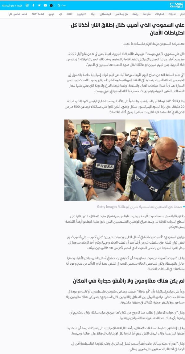 في يوم 11 مايو/أيار 2022، وهو نفس اليوم الذي قُتلت فيه “شيرين أبو عاقلة”، أجرى علي السمودي، مقابلة مع أحد المواقع الإخبارية العربية، وهو موقع “عربي بوست”، الذي نشر تصريحاته كالتالي، وفقا لترجمة مؤسسة كاميرا العربية: