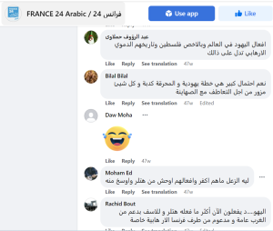 في الواقع، تتخلل وسائل التواصل الاجتماعي لـ فرانس 24 العربية كراهية مقززة للسامية بصورة عامة، وإنكاراً للمحرقة بصورة خاصة. ويسمح نظام التعليقات في قناة فرانس 24 للمعادين للسامية بنشر كراهيتهم بكل حرية، ويتضح ذلك مع رؤية التعليق على تصريحات سيرجي لافروف وزير الخارجية الروسي حول أصول هتلر اليهودية المزعومة، أو عند الحديث عن شهادة الناجين في احتفال اليوم الدولي لذكرى المحرقة أو عند إدراج دراسات المحرقة في مناهج المدارس في الإمارات.