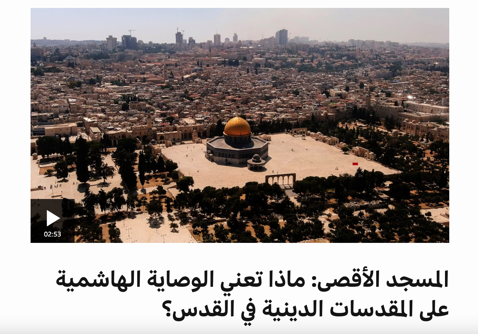 أخطأ تقرير فيديو أعدته الصحفية في “بي بي سي” رندة درويش، في معالجة قضية الوصاية المزعومة للأردن على المواقع المسيحية في مدينة القدس. التقرير نشر على موقع بي بي سي العربي في 7 نيسان/أبريل 2023، وناقش أحداث العنف التي وقعت في ذلك اليوم في الحرم القدسي، غير أنه وفي معرض مناقشته لهذه الأطروحات دون سواها، فقد أخطأت معدة التقرير أكثر من مرة عند تطرقها لنقطة موضوع “الوصاية” المزعومة للأردن على المواقع المسيحية في القدس: