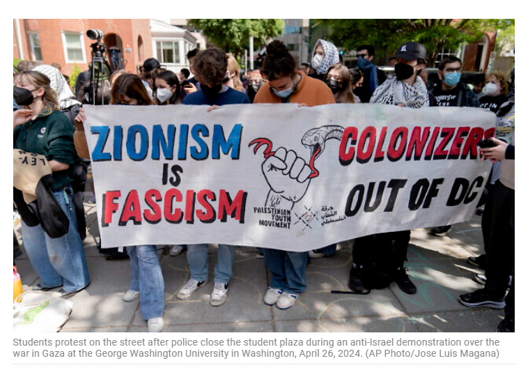 في صورة لوكالة الأسوشيتد برس بتاريخ 26 أبريل/ نيسان 2024، على اليسار، حمل المتظاهرون في جامعة جورج واشنطن لافتة تحذر الصهاينة (“المستعمرين”) من البقاء في واشنطن العاصمة، (من الواضح أن مغادرة الحرم الجامعي في واشنطن العاصمة، الذي تم تسليط الضوء عليه في قصة بينكلي، ليست كافية).