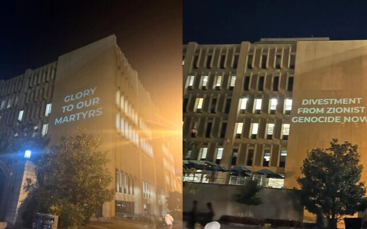 وفيما يتعلق بجامعة جورج واشنطن، إحدى الجامعات التي تم تسليط الضوء عليها، قام الطلاب المؤيدون لحماس في جامعة واشنطن بإسقاط عبارة “المجد لشهدائنا” على أحد مباني الجامعة في 24 أكتوبر/ تشرين أول 2023، في مدح للإرهابيين الذين نفذوا مجزرة 7 أكتوبر/ تشرين أول. (الصورة من حساب Stopantisemitism على منصة X).