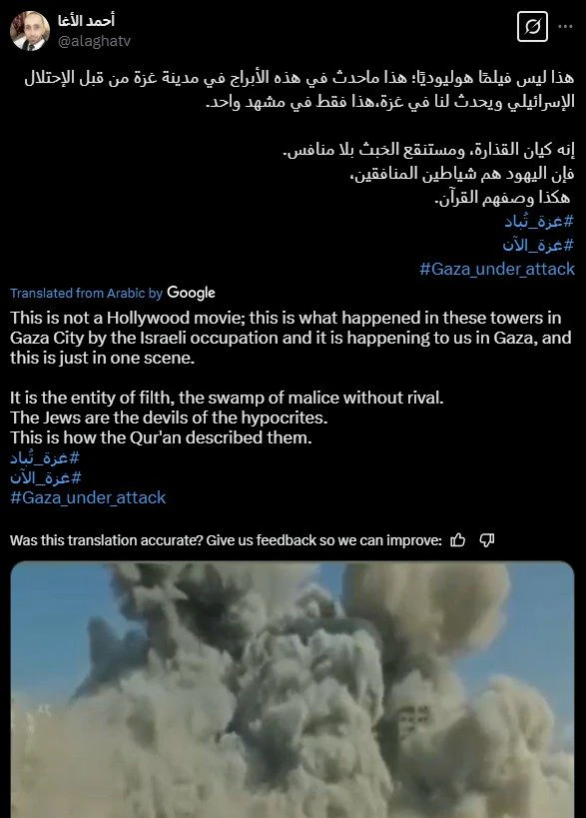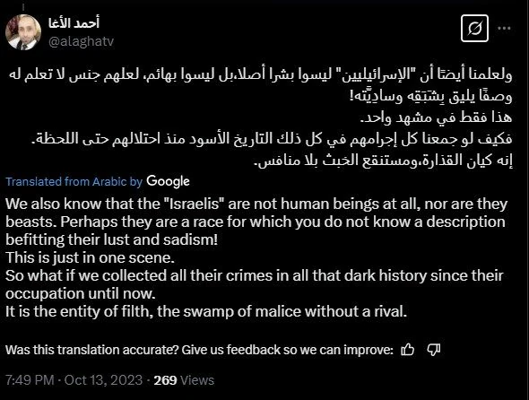 تبيّن الآن أن السيد الآغا، الذي يُقدّم على الهواء كصحفي فلسطيني، قد خصَّ اليهود بالإدانة، ووصف الإسرائيليين بأنهم أسوأ من “الوحوش” على حساباته على مواقع التواصل الاجتماعي. ردًا على لقطات قصف إسرائيل لأبراج غزة في أعقاب هجمات حماس في 7 أكتوبر 2023، نشر الأغا على منصة أكس بعد بضعة أيام: