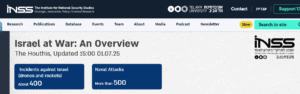 في الواقع، ووفقاً لمعهد دراسات الأمن القومي الإسرائيلي، فقد أطلق الحوثيون “حوالي 400” صاروخ وطائرة مسيّرة على إسرائيل منذ 7 أكتوبر 2023. (انقر على الشريحة السابعة في هذا الرابط عبر هذه الصفحة.