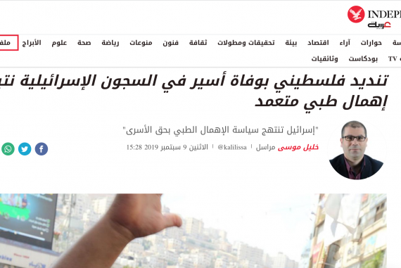 أخطاء وتصحيحات07/10/2019<21/11/2022 قضية السجين الفلسطيني بسام السايح: الإعلام الغربي الناطق بالعربية بين الإقرار بالخطأ وتصحيحه (وكالة أ.ف.ب) وبين التحيّز الأعمى للرواية الفلسطينية (“إندبندنت عربية”)